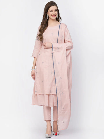 3. Oyster Pink Mal Cotton Thread Work Kurta Pant With Dupatta